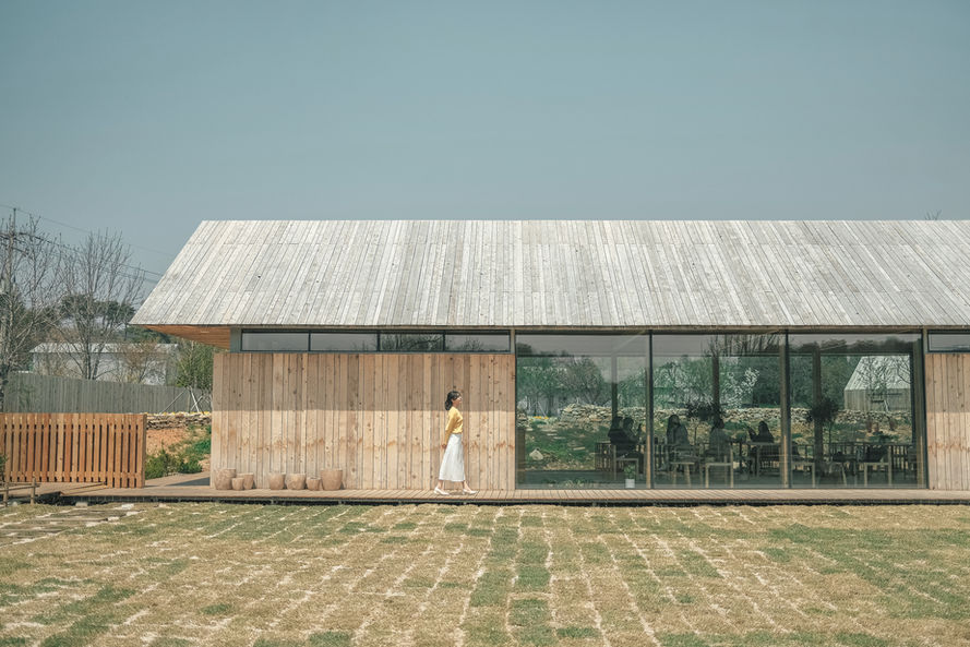 ‘백설농부 카페’는 목가적인 헛간의 원형을 현대적인 기술과 미학으로 재해석한 공간입니다. 구조적 안정성과 심미성을 동시에 갖춘 글루램(Glulam, 공학 목재) 중목 구조를 적용하여, 기둥 없는 시원한 개방감과 정원을 향해 열린 거대한 창을 구현했습니다. 외관은 규화 처리된 적삼목을 사용하여 시간이 흐를수록 자연스럽게 은변하는 나무의 물성을 드러냈으며, 지붕과 벽의 경계를 모호하게 처리한 파사드와 날렵한 처마 라인은 이 건축물이 정원 위에 놓인 하나의 세련된 오브제로 인식되게 합니다.